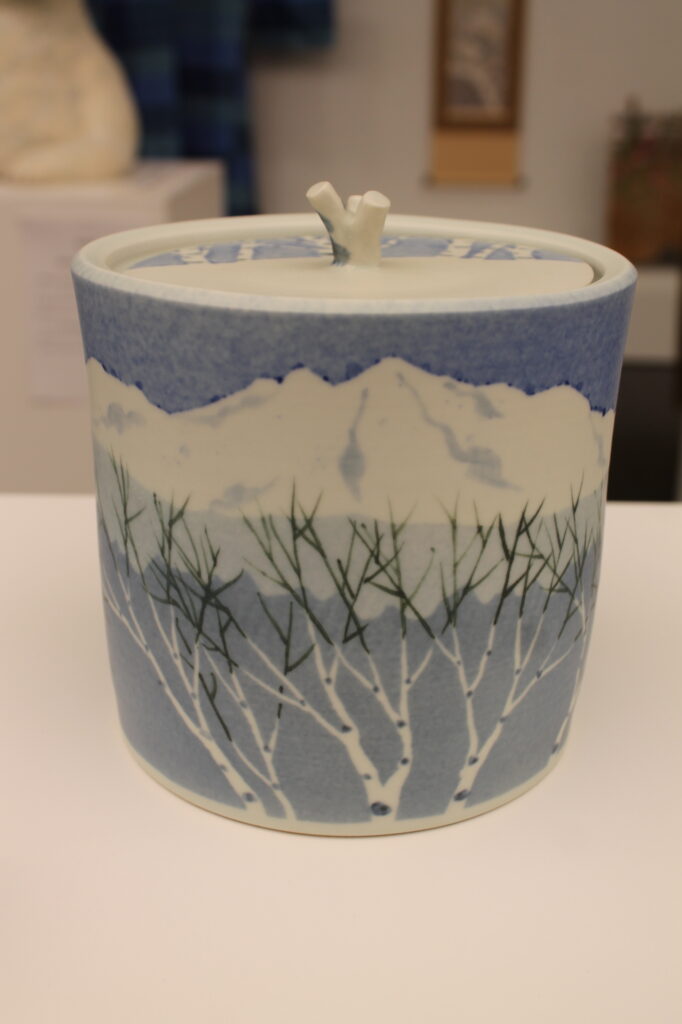 白樺の青い風景は、この作者が長らく取り組んできたモチーフだが、水指という形状に表現することで、より一層、新鮮な印象となった。