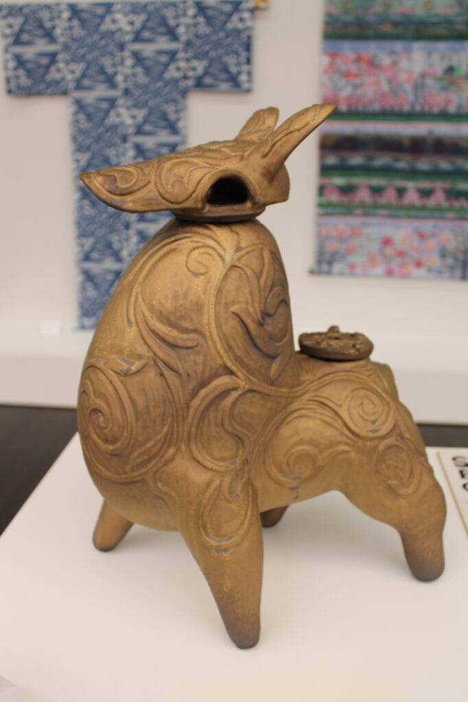 作者によれば、頭、脚、胴などの各パーツを轆轤で成形して繋ぎ、一体にしたもので、中世ヨーロッパの騎馬の甲冑のイメージをヒントにしたという。表面の植物紋様や金色の釉薬も、そうした歴史や古典的な世界を想わせる。