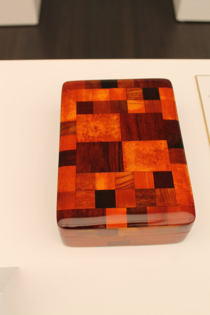 寄木細工とは、色や木目の異なる天然の木材を組み合わせて巧みに幾何学模様を作り出す伝統木工の手法である。本作品は、カエデ、ケヤキ、クロガキなど、それぞれの色や木目の違いを活かし、規則的に配置することにより複雑な模様を作り上げている。茶系統のその色合いと、上蓋の角を落としやや丸みを帯びさせたことで、作品から温かみも感じられる。