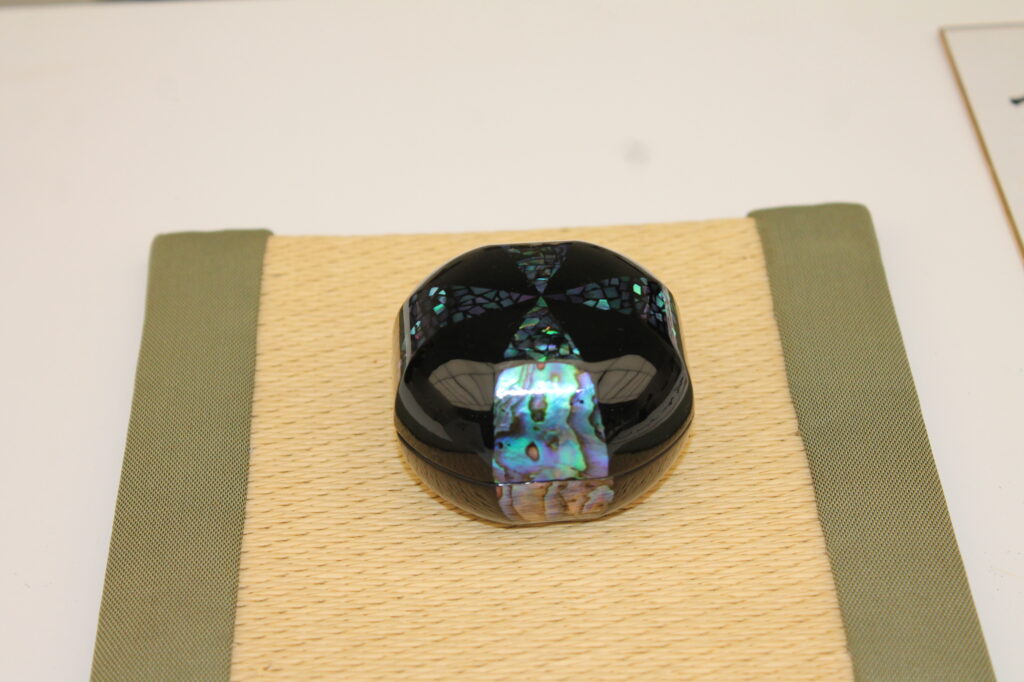 角を丸めた正方形の黒漆の香合。蓋から身に連続する十字形の象嵌は、鮮やかな色調のアワビの仲間の貝殻を埋め込んで研ぎ出したもの。上方の細かい貝片は玉虫貝、下方の広い面積の貝片はニュージーランド貝で、いずれも日本のアワビより濃厚な色彩を放っている。身の内側は緑を帯びた銀灰色に塗られている。小さいながら凝縮された蠱惑の美を放つ逸品。