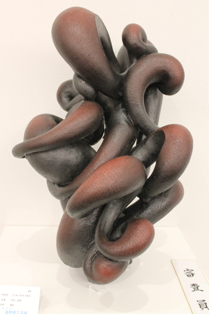 作者によれば、心の深層で生じる情動のようなものを表現したという。動き続ける作者の心情と、土の可塑性に基づく柔軟な形体が見事に合致し、生命力と存在感溢れる作品となった。 (外舘 和子)