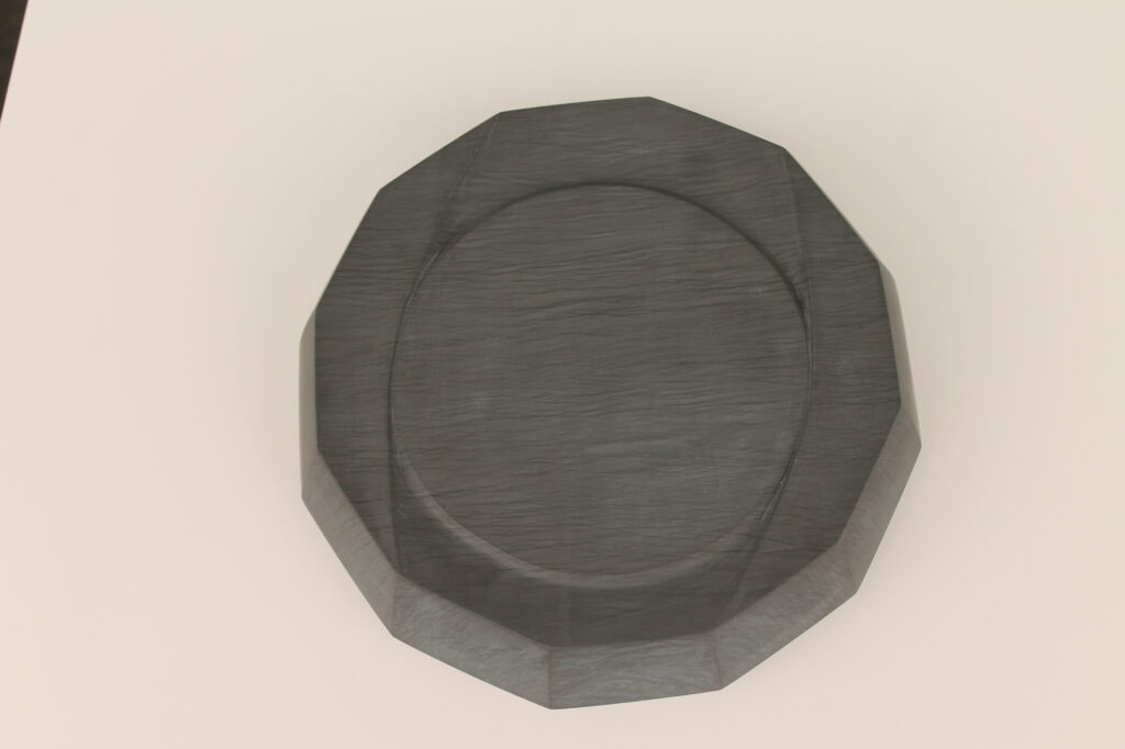 中国の安徽省・江西省でとれる歙州(きゅうしゅう)と呼ばれる石材を使った硯。硬く緻密な石質で男性的な重厚感があると評される。12面体の側面を傾斜を付けながら面取りし、底部に近づくほど絞り込んで全体のフォルムをキリリと引き締めている。墨を擦る陸(おか)と呼ばれる部分はやや縦長の楕円に成形し、上方に墨を溜める海といわれるくぼみを彫り込んでいる。陸の左右は凹面に削り柔らかい表情を付けている。裏返すと底面を彫って接着剤と練った銀粉を埋め込んだ5行20文字の篆書の象嵌がある。前漢の劉向が編纂した故事・説話集『説苑』(ぜいえん)にある天子を戒めるための逸話の一節「土積もれば山となる」(寸陰を惜しんで学問すべきこと。わずかな土でも積もれば山となるの意味)を記入してある。